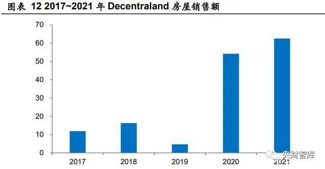 在规划方面,现实中地产是由 房地产开发商进行楼盘的选址与设计,住户只能选择栋数或楼层,并只对内部装修 具有自主权,而虚拟地产的拥有者可以根据喜好选择地皮位置,并可以在购买的土地上任意设计,自主划分区域,可将房屋内外打造成自己喜欢的样子。Decentraland 公司在平台上共推出了 90601 块土地,最小的交易单位是 1块土地,这些土地被划 分为不同的区域,如加密货币谷、时尚街、博彩区等,买家可以投标其中的土地,将 其建成住宅区或商业区,也可以从二级市场直接购买。在 2021年的元宇宙热潮中, Decentraland 平台上的房屋销售额迎来新高,上升至 6300 万美元。