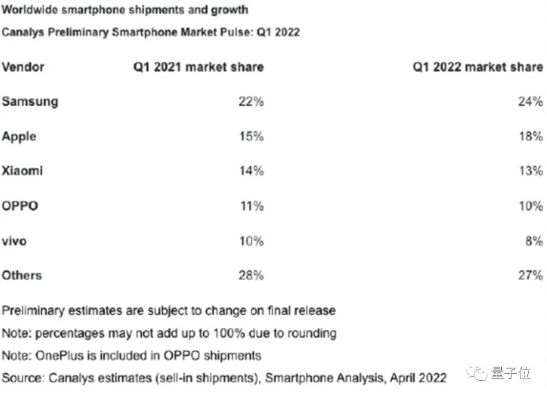 Canalys最新数据显示:2022年第一季度全球智能手机出货量下降了11%,三星以24%的市场份额重回第一。