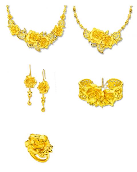 Goldstyle足金通过崭新的制金技术,提升一般足金硬度约两倍。以金光闪烁的足金打造出桃花盛开的曼妙姿态,融入镂空花瓣的拼迭设计,为绽放的花朵增添了时尚和层次感,灵动立体,祈愿新人收获浪漫美好的爱情。