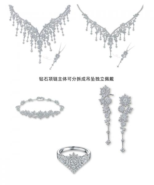 独特的剑脊造型呈现简约立体的戒臂,仿如守护这段坚不可摧的缘份;并巧妙地融入Hexicon六角形元素,运用几何三角爪紧托一颗纯澈耀目的闪钻,让钻石光芒倍添璀璨,见证满满的幸福时刻。炽热爱意多颗闪烁生辉的钻石镶嵌于柔美灵动的流苏曲线之上,犹如散落的阳光,环绕成朝气十足、争相盛放的太阳花,点缀梦幻的白纱,唯美绚烂、华丽优雅。项链亦可灵活拆分成钻石吊坠,百搭造型,满足新娘多变搭配。