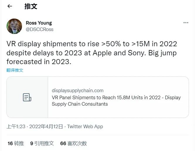 DSCC于4月12日发布了有关AR/VR显示面板趋势的报告,并指出VR面板发货量在2022年将增长50%,达到1500万+。而该机构的分析师Ross Young在twitter表示,索尼和苹果的AR/VR头显新品都将跳票至2023年,且随着索尼PSVR2的推出,AMOLED屏幕也将回归。