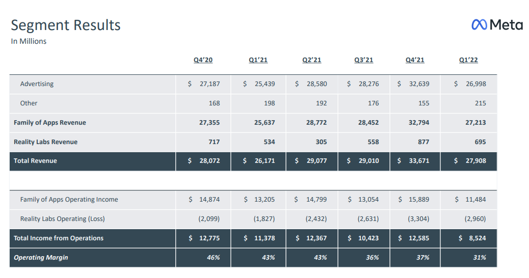 由于facebook用户重回增势,一季度Meta整体盈利降幅比市场预期小,AR/VR元宇宙业务营收高于预期(分析师预期6.771亿美元,实际6.95亿美元),Meta盘后股价飙升,一度暴涨超18%。这是Meta第二份单独披露AR/VR业务数据的财务报告,其首席执行官扎克伯格在Connect 2021大会中宣布,从2021年Q4财报开始将财报分成两个部分:应用家族(Facebook、Instagram和WhatsApp等)和负责公司元宇宙业务的部门Reality Labs。
