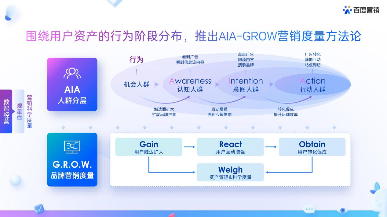 同时围绕用户资产的行为阶段分布,即认知人群、意图人群、行动人群的不同分层,百度营销推出了“AIA-GROW营销度量方法论”, 全链路数智经营帮助品牌精准触达目标人群,高效促成转化,同时评估不同人群的投放效果,使整体投放效果可衡量可优化。