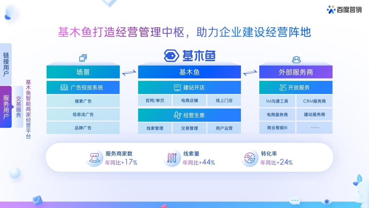 在后链路经营转化部分,百度营销通过基木鱼智能商家经营平台,为企业提供从营销建站、线索转化、商品闭环到用户运营的一站式生意经营全链解决方案,打造企业经营管理中枢,助力企业建设闭环经营阵地。