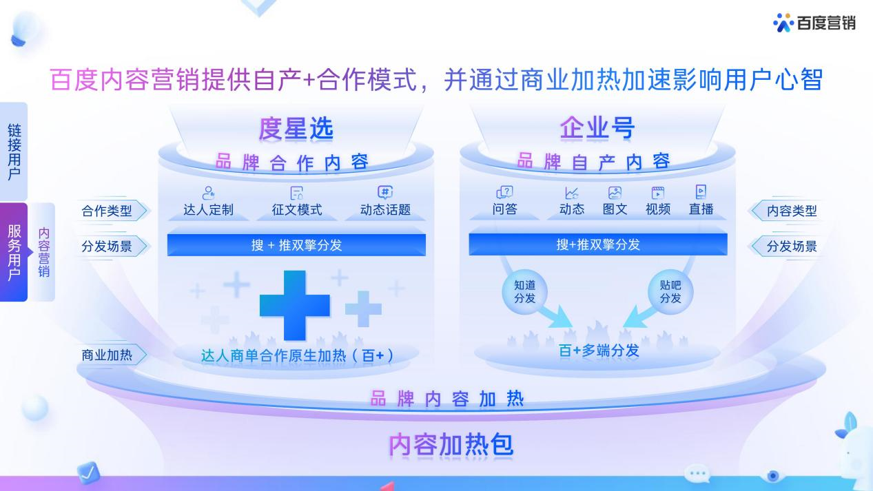 在前链路用户沉淀部分,百度营销提供“自产+合作”模式,并通过“百+”商业加热加速影响用户心智,打造从内容生产到加速分发的一体化企业营销新场景,为整个链条起到了导流获客、流量沉淀的作用。