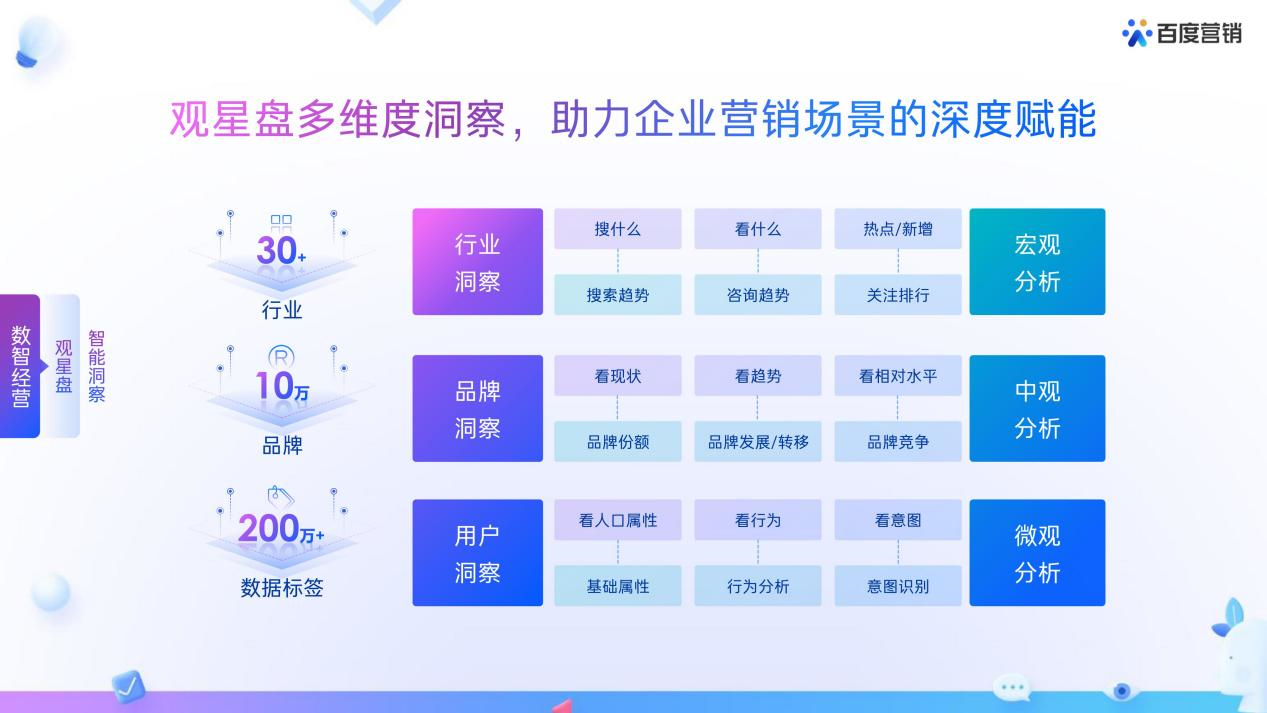 随着媒介的碎片化和信息的粉尘化,可量化的精准营销已成为大势所趋,而百度的全链营销数据引擎观星盘,基于百度AI技术以及大数据能力,为品牌输出全链路数字营销解决方案。