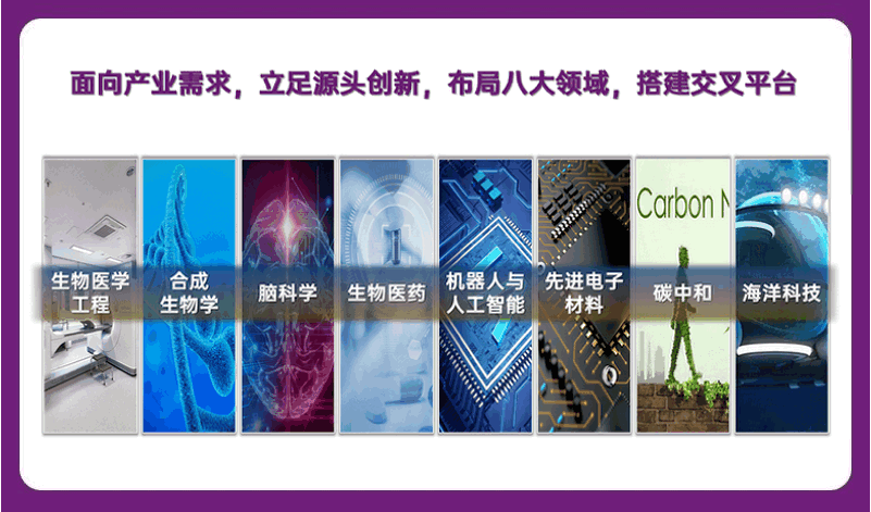 面向产业需求,立足源头创新,布局八大领域,搭建交叉平台。集中主要力量打造6个世界一流学科:生物医学工程、合成生物学、脑科学、生物医药、机器人与人工智能、先进电子材料。