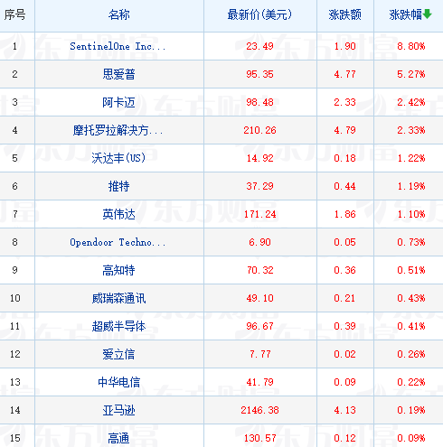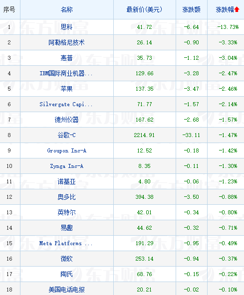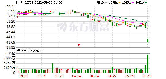 思科公司重挫13.73%元。思科报告称第三财季业绩低于市场预期,且预计本季度销售量将意外下滑。在截至4月30日的当季,公司每股盈利为87美分。营收为128亿美元,低于分析师一致预期的133.4亿美元。