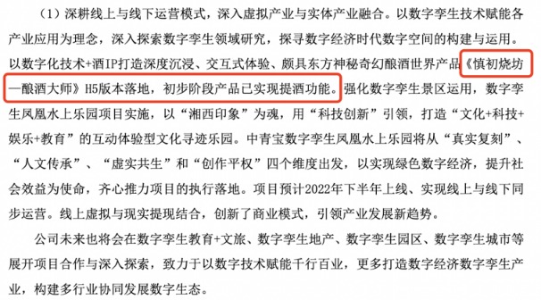 中青宝年报显示,《酿酒大师》H5 版本已落地,初步阶段产品已实现提酒功能。但这并未作为重要进展着重在财报中体现,只被一笔带过。