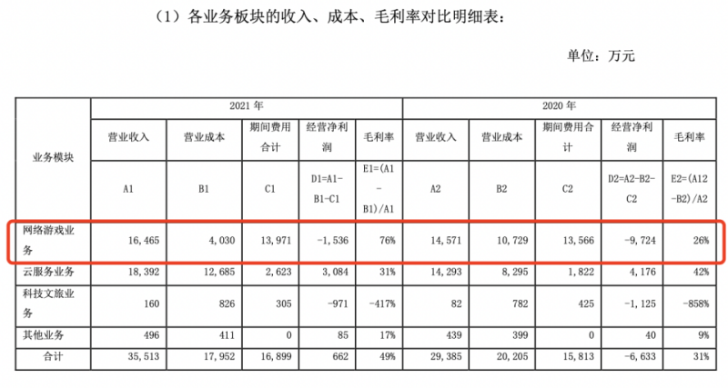 不过,根据游戏业务板块收入、成本、毛利率对比明细表,其2021年网络游戏业务营收为1.65亿元,营业成本为4030万元,期间费用合计1.4亿元,由此计算出经营净利润为-1536万元。而在2020年,其网络游戏业务营收为1.46亿元,营业成本为1.07亿元,期间费用合计1.36亿元,由此计算出经营净利润为-9724万元。
