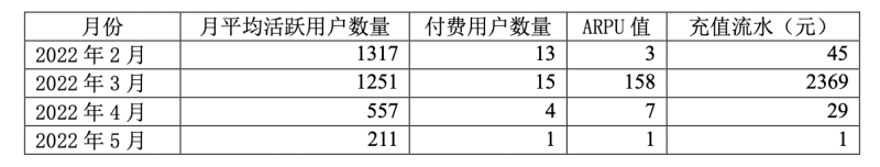同时,根据其披露的《酿酒大师》的月平均活跃用户数量、付费用户数量、月平均ARPU值,整体数据呈现大幅下滑趋势。2022年5月月平均活跃用户数量为211,付费用户数为1,ARPU值为1,充值流水为1元。