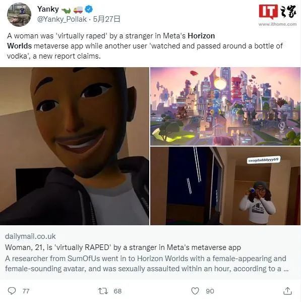 她在 META 元宇宙游戏《地平线世界》中创建了一个女性虚拟形象,通过游玩进行相关研究。然而,在体验“元宇宙”不到一个小时,她便受到了一位男性虚拟人物的“性侵”。* 图片来源 IT 之家
