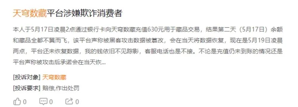 此外,在黑猫平台上也有不少关于天穹数藏的投诉,大部分涉及藏品虚假交易不发货、提现迟迟未到账、账号被注销等。