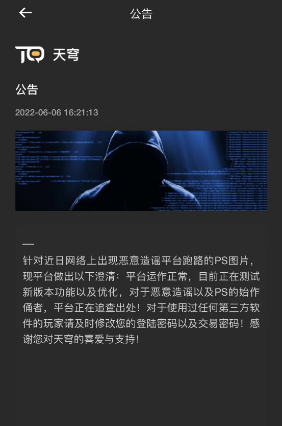 平台运营状况良好,目前正在测试新版本功能以及优化,用户的合法权益在天穹均会得到法律保障。对于恶意造谣以及PS的始作俑者,平台正在追查出处,并保留诉诸法律手段的权利,请别有用心的人士自重。另对于使用过任何第三方软件的玩家,请及时修改您的登陆密码及交易密码,以确保您的财产安全。