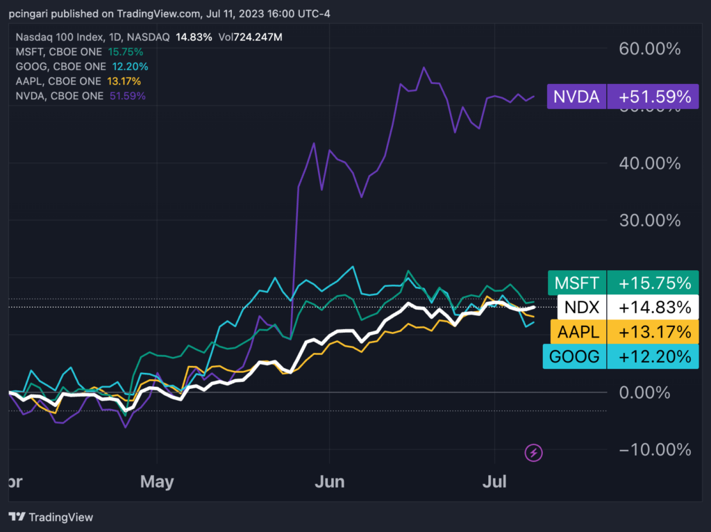 整个二季度,英伟达累涨超51%,远超谷歌(+12%)、苹果(13%)、微软(16%)和纳指100(15%)。5月底,英伟达市值突破一万亿美元关口,成为第七家跻身万亿美元俱乐部的公司。