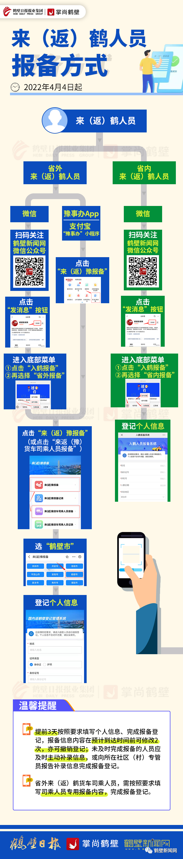 所有省外来(返)鹤人员须持“两码一证明”(健康码、行程码绿码,48小时内核酸检测阴性证明),通过“来(返)豫人员社区报备系统”提前3天报备。