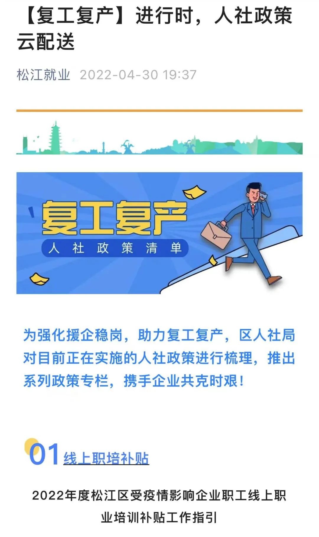4月22日,松江在全市率先召开人社系统强化稳岗就业服务复工复产工作会议,发布了《强化稳岗就业服务复工复产工作方案》,梳理人社领域在援企稳岗、就业帮困、用工保障、培训补贴、人才支持等方面政策清单17项,制定惠企政策申报指引,帮助企业应对疫情影响、纾困解难。
