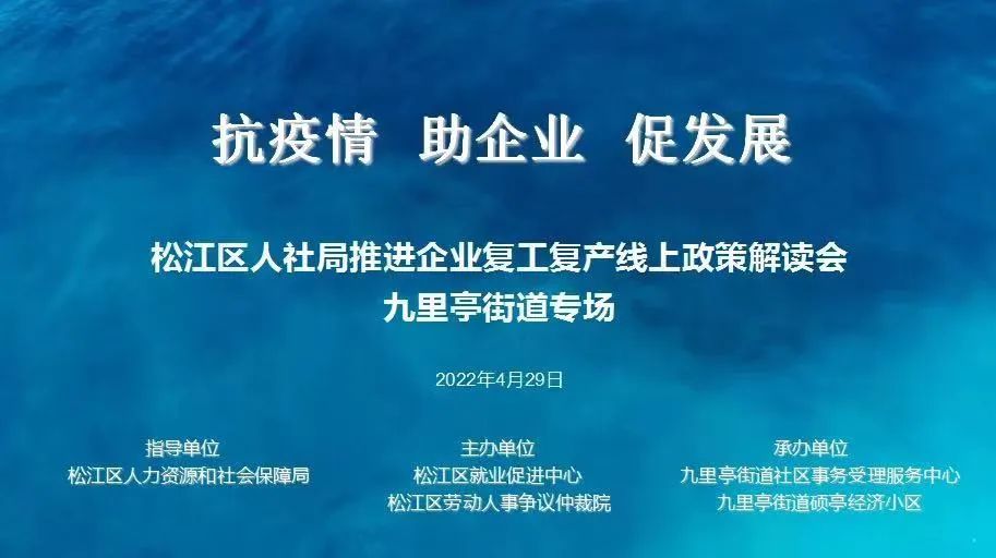 4月29日,由区就业促进中心和区劳动人事争议仲裁院共同主办、九里亭街道社区事务受理服务中心和九里亭街道硕亭经济小区共同承办的“抗疫情、助企业、促发展”推进企业复工复产线上政策解读会举行,共吸引180余名企业代表参加。会上,就复工复产援企纾困政策、创业扶持政策进行了线上解读,确保政策直达企业,让企业劳动者尽快享受政策红利。此后,解读会在方松街道、小昆山镇、新浜镇及各园区举行,通过“云配送”模式,与街镇园区同向发力,实现政策“一键直达”。