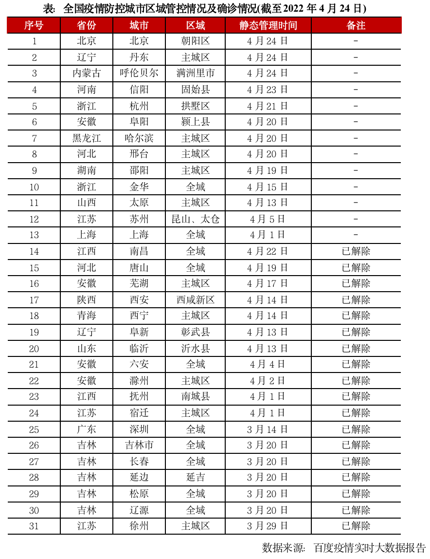 3月以来,超过30个城市紧急发布静态管理疫情防控公告,其中,苏州、太原等城市仅在疫情高发的重点区域实行管控,而上海、深圳、长春等实行全域静默管理,期间全城非必要经营活动暂停,房地产市场也因此几乎陷入停摆。截至4月24日,仍有13个城市处在局部或全域静态管控当中,全国尚存在111个中高风险地区。