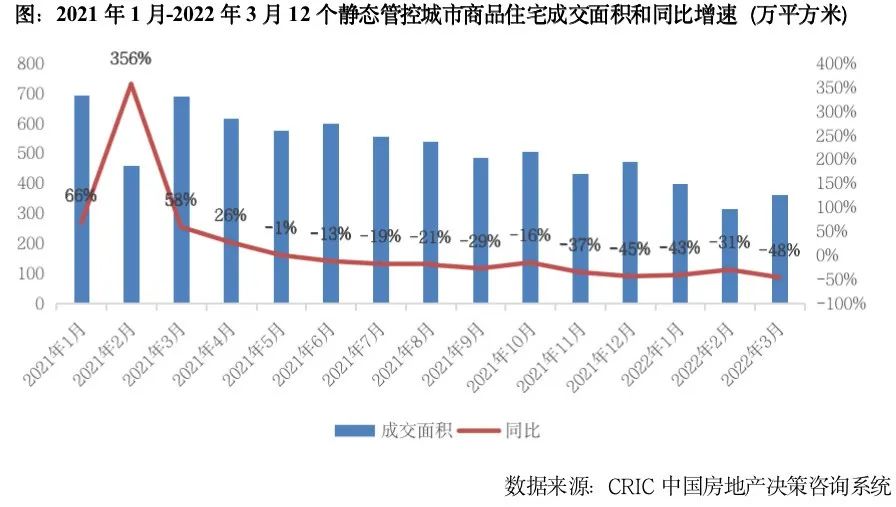 静态管控城市楼市近乎停摆,成交加速下滑。3月,12个静态管控城市商品住宅成交面积362万平方米,同比下跌48%,跌幅较2月扩大17个百分点。