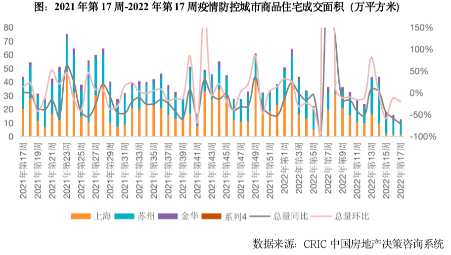 第17周,3个尚在静态管控中的城市,新房成交面积共计13万平方米,仅为2022年周平均规模的1/3,环比下跌20%,同比跌幅扩大至71%。