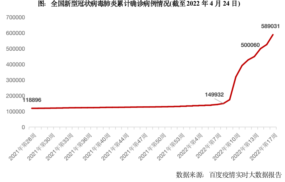 2月下旬以来,全国新冠确诊病例数呈快速攀升走势,累计确诊病例数突破50万。截至4月24日,全国(含港澳台)报告累计新型冠状病毒肺炎确诊病例58.9万例,较一周前增加6.3万例,较2022年初增加45万例,累计死亡病例14881例,较年初增加近1万例。