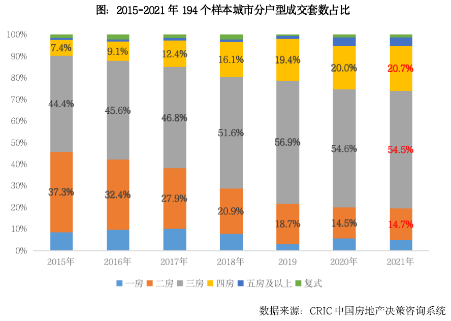 受限贷政策影响,大量改善性需求被压制。2021年,改善性需求相对坚挺,据CRIC重点监测的 194个样本城市成交结构数据显示,三房成交套数占比高达54.5%,四房成交占比稳步提升至20.7%。但受限贷政策影响,不少城市二套房首付比例都在50%以上,部分城市更是达到70%乃至80%,很大程度上提升了改善性客群首付款支出压力,大量改善性需求被压制。