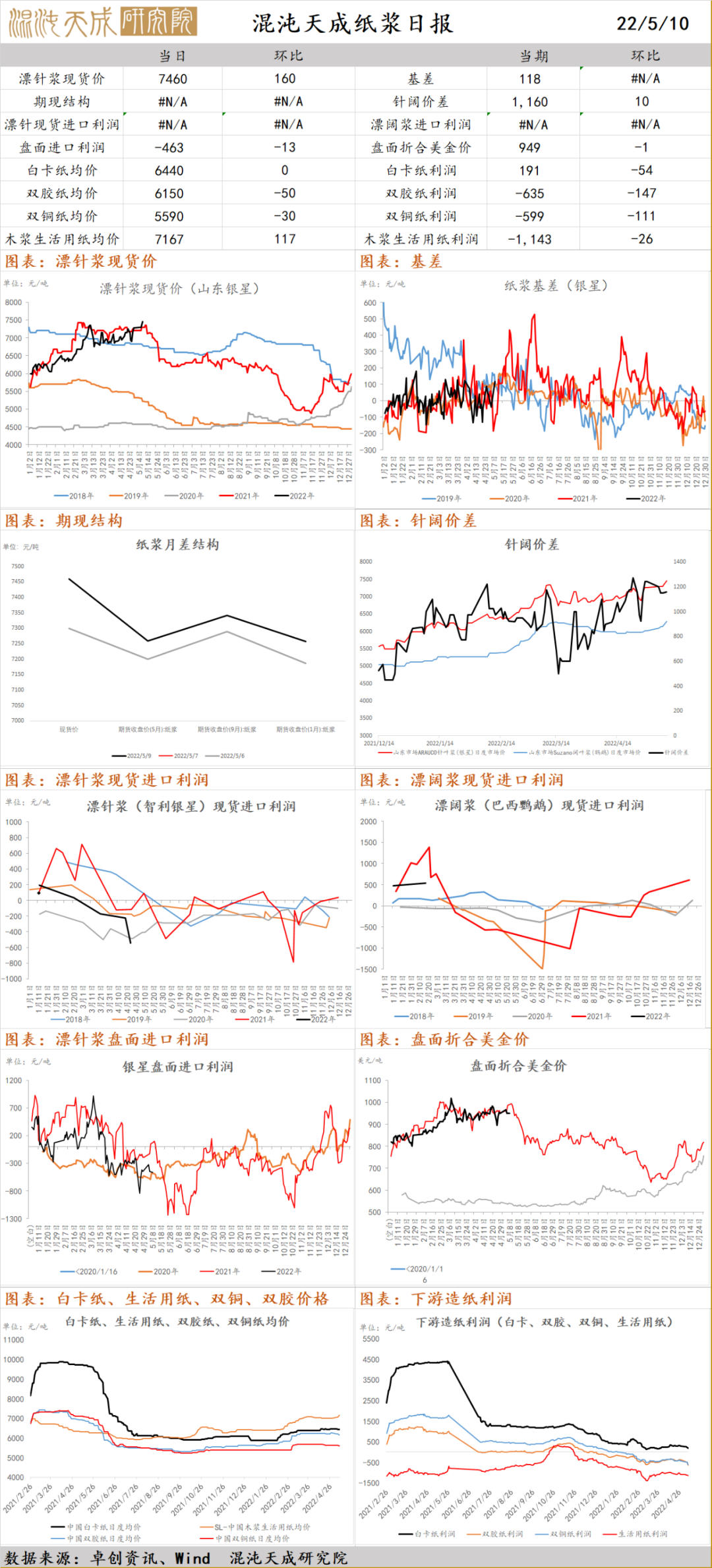 纸浆:5月7日,最大的阔叶浆生产商Suzano宣称纸浆库存一直在逐渐减少,未来可能发生供应中断;智利至少7名暴力分子要求释放马普切政治犯,对南部5号公路卡车司机开枪射击、烧毁车辆,卡车司机罢工要求政府保障安全,导致部分锯木厂、纸浆厂临时停产;昨日国内针叶浆和阔叶浆现货均价上涨约150元/吨,中小型纸厂采浆清淡,大型纸厂按需采购;下游生活用纸市场局部重心继续上移,广东地区白卡纸价格偏弱,山东和广东地区文化用纸价格偏弱;国内坚持动态清零政策不动摇,对需求端仍有一定压制,预计短期维持震荡,关注国内疫情发展和出口订单情况。