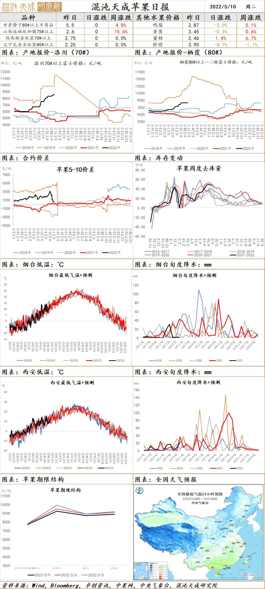 苹果:10日08时至14日08时,我国北方地区将有一次较强冷空气活动,华北北部和西部、西北地区东部、新疆大部等地将有4~8℃降温,其中,西北地区东北部、东北地区中北部等地部分地区降温可达10℃以上,并伴有4~6级大风,阵风7~9级;产地近期交易量不及之前,山东产区冷库出库价格有偏弱迹象,当地冷库客商采购比之前谨慎,存储商出货积极性比较高;西北产区剩余货量不大,逐渐进入尾期,价格基本稳定,好货偏少,好货价格居高;后期持续关注坐果套袋及国内疫情发展情况。