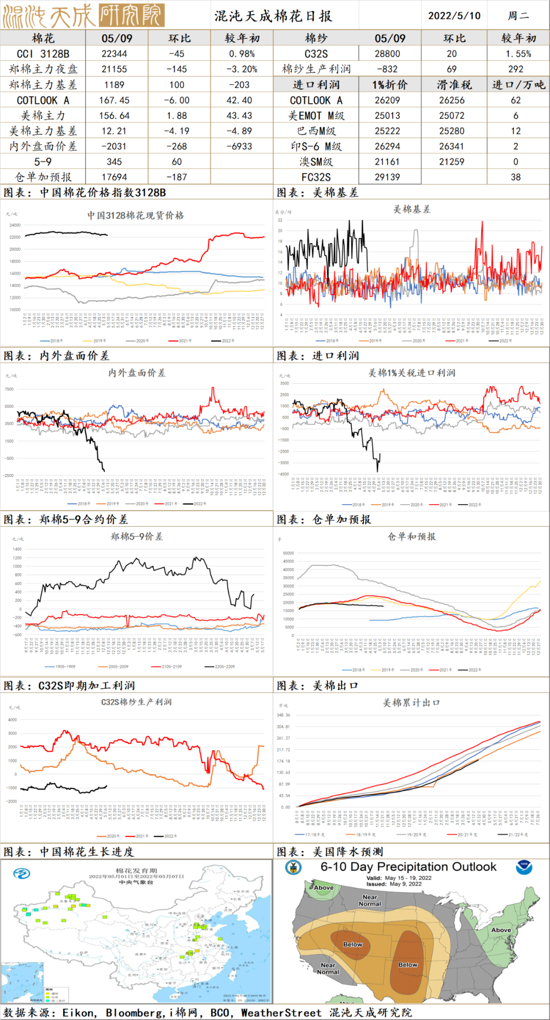 供应端:USDA四月对21/22年度供应预测微增,略超预期。北半球美国整体干旱略有缓解,但得州干旱加剧。国内新疆气候良好,南疆开始大面积播种,但因为棉粮种植要求和退耕还林政策,种植面积可能难以增长。南半球种植顺利,气候条件良好,目前符合预期。供应链似乎有所缓和。需求端:USDA四月对21/22年度需求下调0.4%,因中国疫情。4.22-4.28日一周美国2021/22年度陆地棉净签约52685吨(含签约56585吨,取消前期签约3900吨),较前一周大幅增加92%,较近四周平均增加101%;装运2021/22 年度陆地棉96751吨,较前一周增加11%,较近四周平均增加11%。国内坚持清零,利空出行消费。本轮国内复工进度慢于往年。目前海外纱厂也陆续亏损,高价开始抑制印度需求,印度纺织厂在库存不高的情况下也开始减少棉花采购。郑棉基差略高于正常区间,外强内弱导致进口利润跌至5年低点,预计内外价差进一步走低。得州预报干旱和印度高温使得美棉抗跌,关注今晚USDA棉花供求的调整。