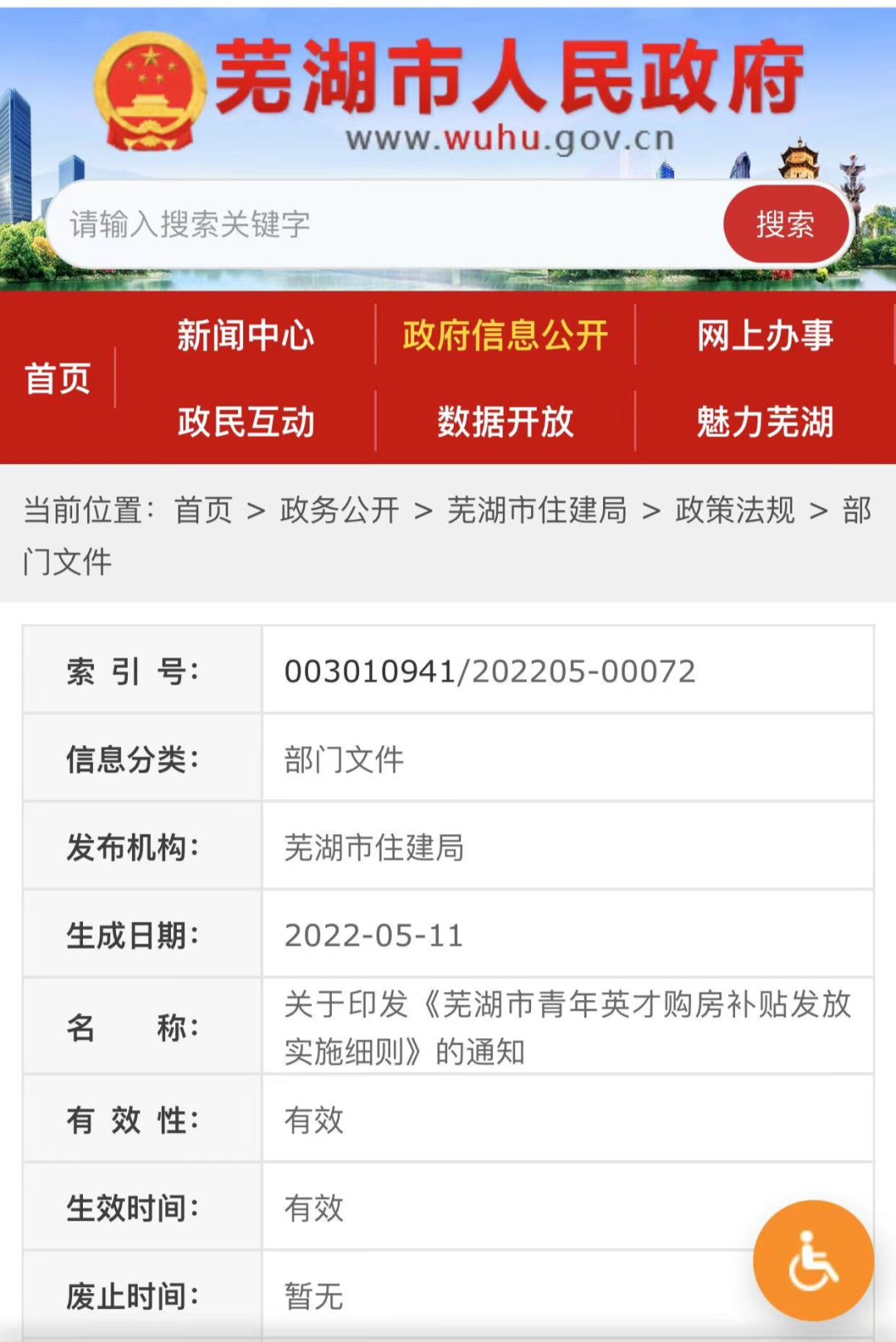 为进一步完善我市人才安居保障制度,芜湖再出“大招”!5月10日,芜湖市住建局、市人社局、市财政局、市民政局、市自然资源和规划局、市教育局、国家税务总局芜湖市税务局联合发布最新《芜湖市青年英才购房补贴发放实施细则》,符合条件青年英才可享受购房款 12%最高 20 万元的购房补贴。新购房屋为夫妻共有,且夫妻双方均符合申报条件的,可以共同申请,叠加享受政策。