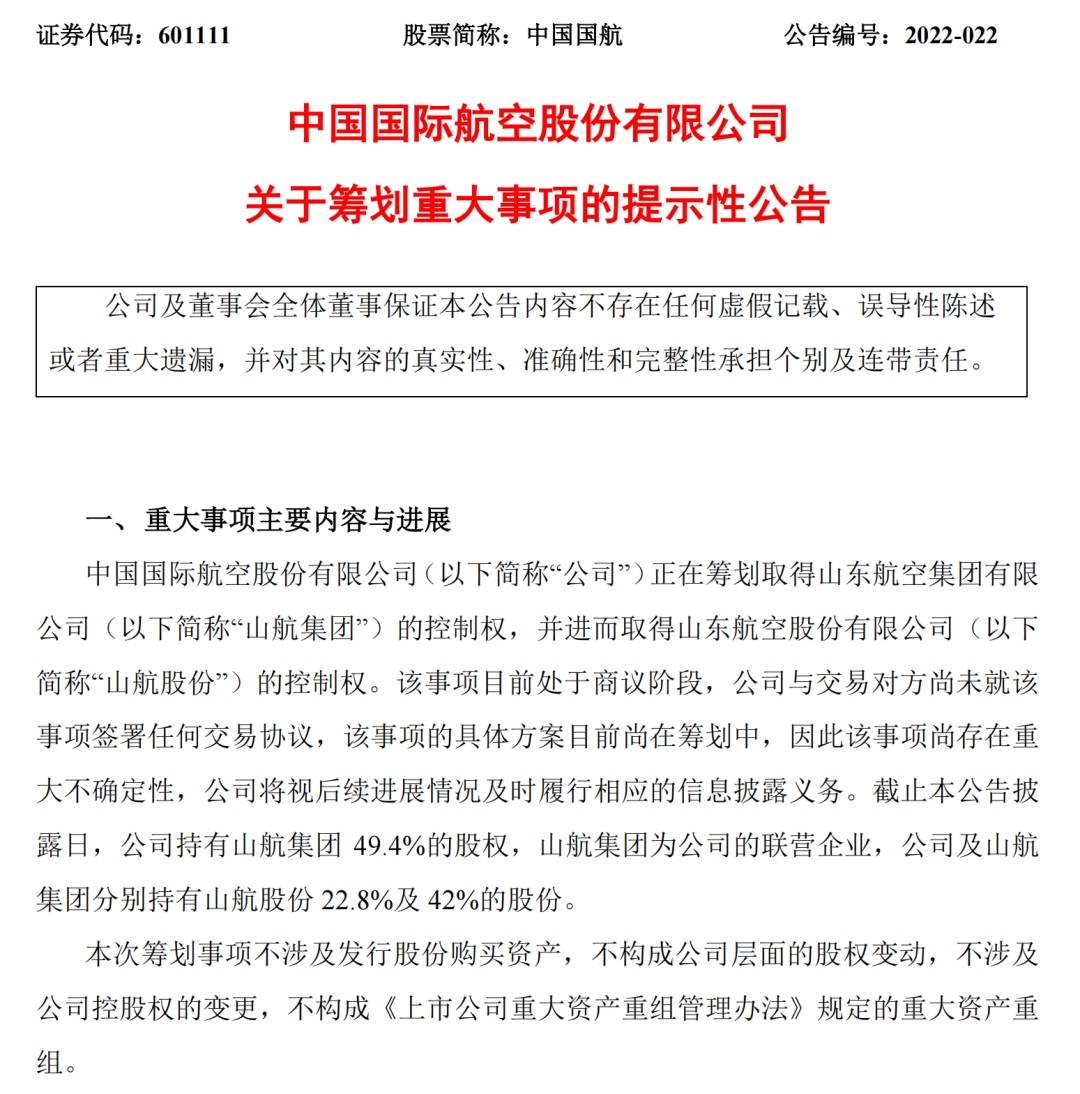 中国国航称,本次筹划事项不涉及发行股份购买资产,不构成公司层面的股权变动,不涉及公司控股权的变更,不构成《上市公司重大资产重组管理办法》规定的重大资产重组。