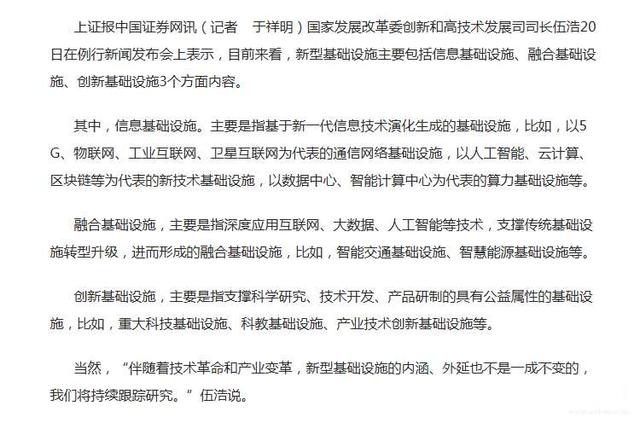 在 4 月 20 日国家发改委召开例行在线新闻发布会上,创新和高技术发展司司长伍浩先生回应了关于新型基础设施的问题。据伍浩介绍,初步研究认为,新型基础设施是以新发展理念为引领,以技术创新为驱动,以信息网络为基础,面向高质量发展需要,提供数字转型、智能升级、融合创新等服务的基础设施体系。