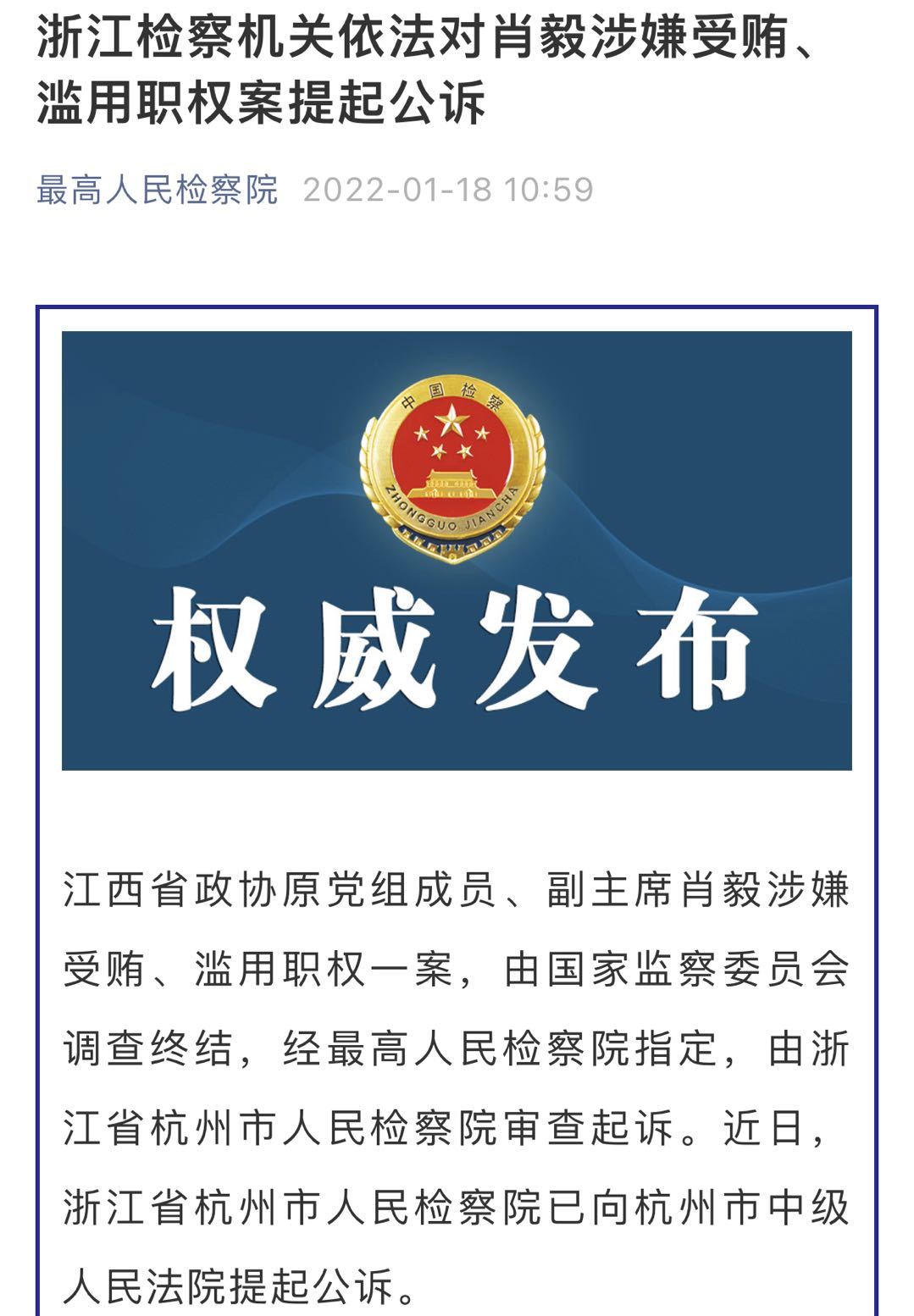 “最高人民检察院”微信号1月18日信息显示,江西省政协原党组成员、副主席肖毅涉嫌受贿、滥用职权一案,由国家监察委员会调查终结,经最高人民检察院指定,由浙江省杭州市人民检察院审查起诉。近日,浙江省杭州市人民检察院已向杭州市中级人民法院提起公诉。