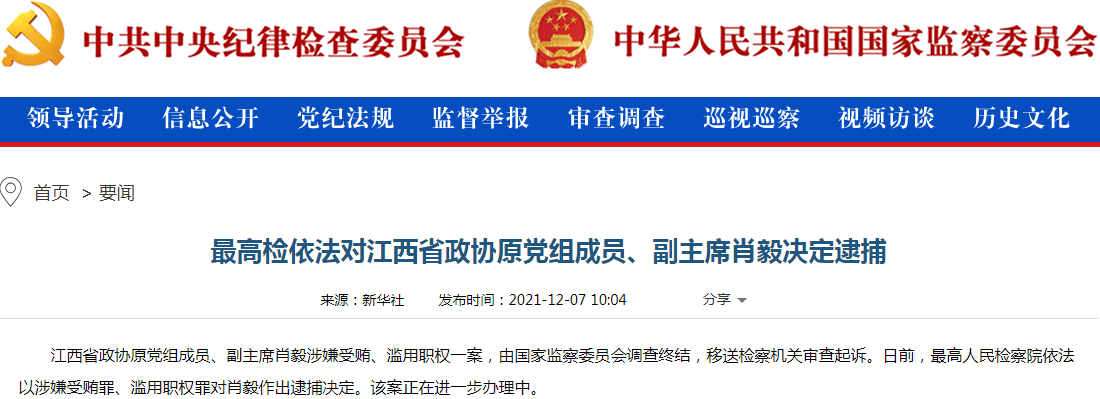 此前,中央纪委国家监委网站2021年12月7日信息显示,江西省政协原党组成员、副主席肖毅涉嫌受贿、滥用职权一案,由国家监察委员会调查终结,移送检察机关审查起诉。日前,最高人民检察院依法以涉嫌受贿罪、滥用职权罪对肖毅作出逮捕决定。该案正在进一步办理中。简历资料显示,肖毅曾任江西抚州市委书记。