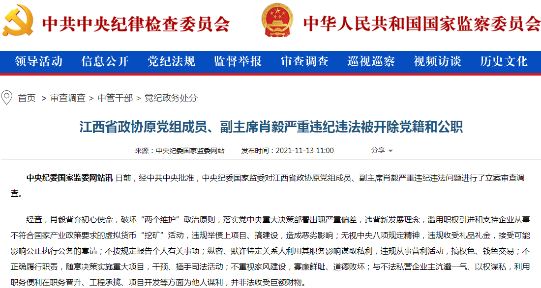 肖毅于2021年5月被查,同年11月被“双开”,据当时的处理通报,肖毅背弃初心使命,破坏“两个维护”政治原则,落实党中央重大决策部署出现严重偏差,违背新发展理念,滥用职权引进和支持企业从事不符合国家产业政策要求的虚拟货币“挖矿”活动,违规举债上项目、搞建设,造成恶劣影响;无视中央八项规定精神,违规收受礼品礼金,接受可能影响公正执行公务的宴请;不按规定报告个人有关事项;纵容、默许特定关系人利用其职务影响谋取私利,违规从事营利活动,搞权色、钱色交易;不正确履行职责,随意决策实施重大项目,干预、插手司法活动;不重视家风建设,寡廉鲜耻、道德败坏;与不法私营企业主沆瀣一气、以权谋私,利用职务便利在职务晋升、工程承揽、项目开发等方面为他人谋利,并非法收受巨额财物。