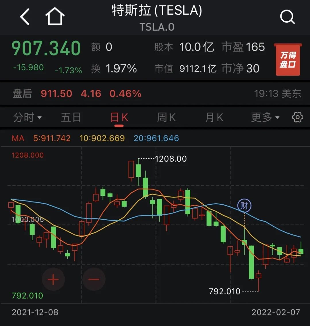 截至美东时间2月7日收盘,特斯拉股价下跌1.73%,报收907.34美元/股,总市值为9112.1亿美元。