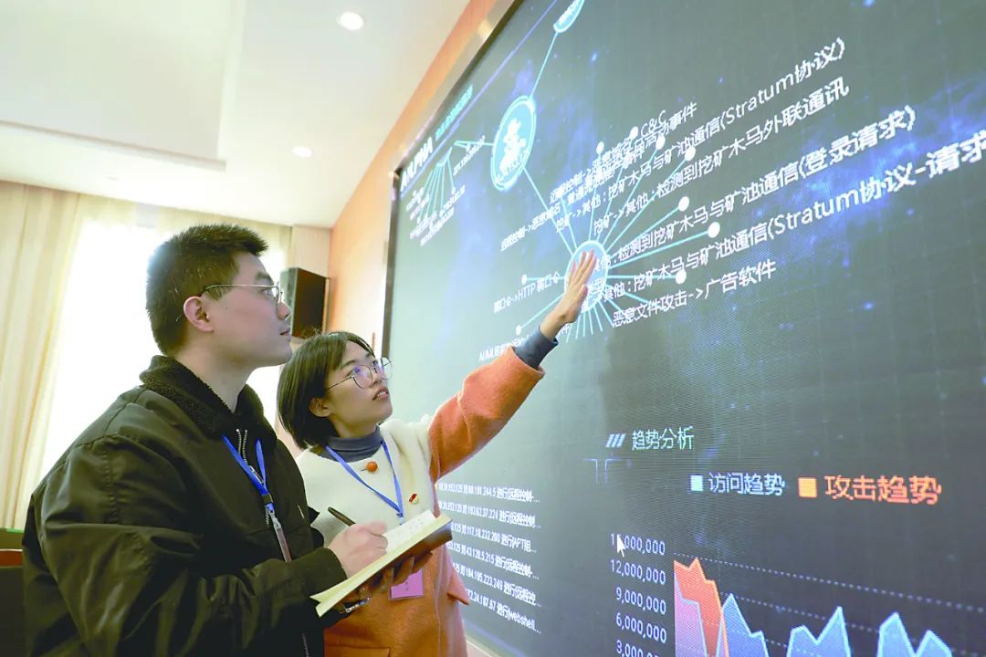 近期,浙江省武义县纪委监委成立专项监督组,深入相关职能部门和机关单位,通过远程监测、技术核查等方式,对利用公共资源参与虚拟货币“挖矿”与交易问题开展专项检查。图为专项检查组在县大数据中心利用大数据智能安全分析平台了解相关情况。季文 摄