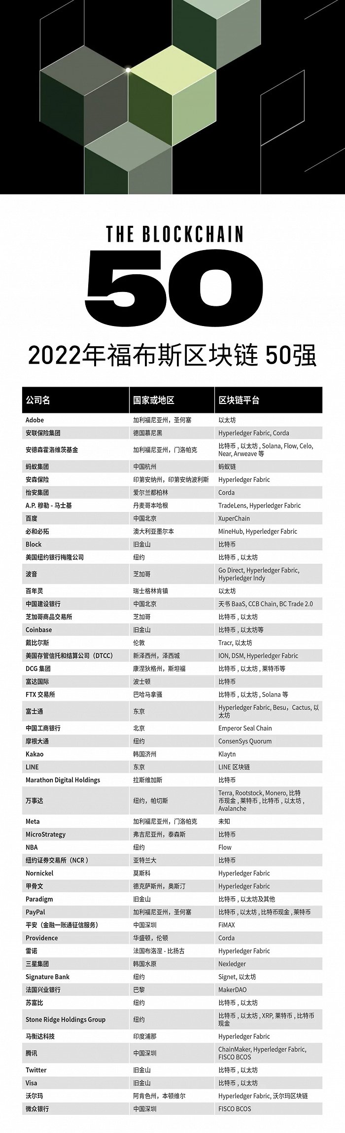 福布斯发布2022年全球区块链50强榜单,蚂蚁、百度上榜