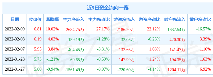 资金流向数据方面,当日主力资金净流入2684.75万元,游资资金净流入2186.2万元,散户资金净流出1637.54万元。近5日资金流向一览见下表: