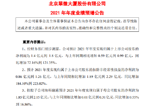 此前1月18日,翠微股份发布2021年年度业绩预告,预计2021年归属于上市公司股东的净利润为1.4亿元到1.8亿元,同比增加72.16%到121.35%;扣除非经常性损益的净利润与上年同期相比增加1.89亿元到2.29亿元,同比增加184.1%到223.02%。