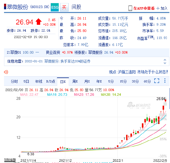 今日翠微股份开盘不久就一字涨停。截至收盘,公司股价报26.94元/股,最新市值为215.18亿元。最新数据显示,该股股东人数为14149户。