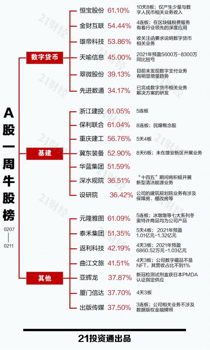 透视一周20大牛熊股:数字货币与基建板块强势领涨最熊股5日蒸发116亿元