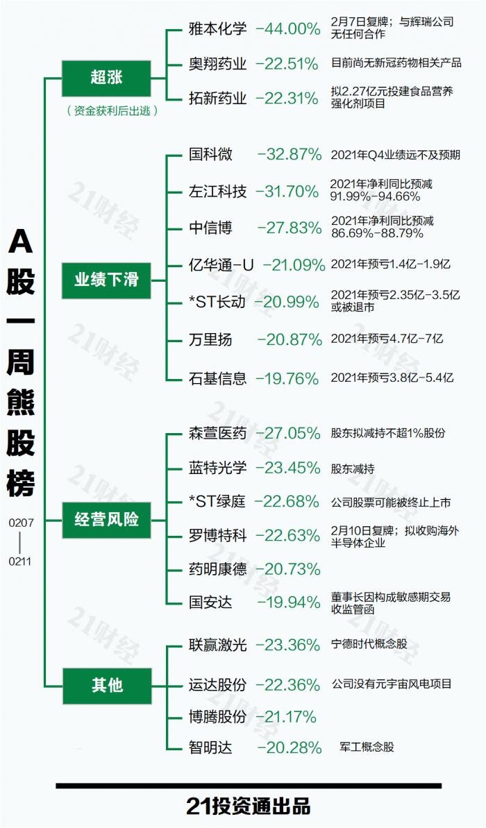 进入业绩预告披露期,当周7家公司因业绩预减致股价下挫而落入熊股榜,跌幅均在20%以上,其中*ST长动(维权)(000835.SZ)累计跌20.99%。*ST长动业绩预告显示,预计2021年净利润亏损2.35亿元至3.5亿元,全年营业收入预计为180万元至230万元,2021年末净资产为-7.5亿元至-11亿元,上述三项指标均触碰了退市红线,或在年报正式披露后终止上市。截至2月11日收盘,*ST长动总市值跌剩4.67亿元,为A股市场倒数第二名。