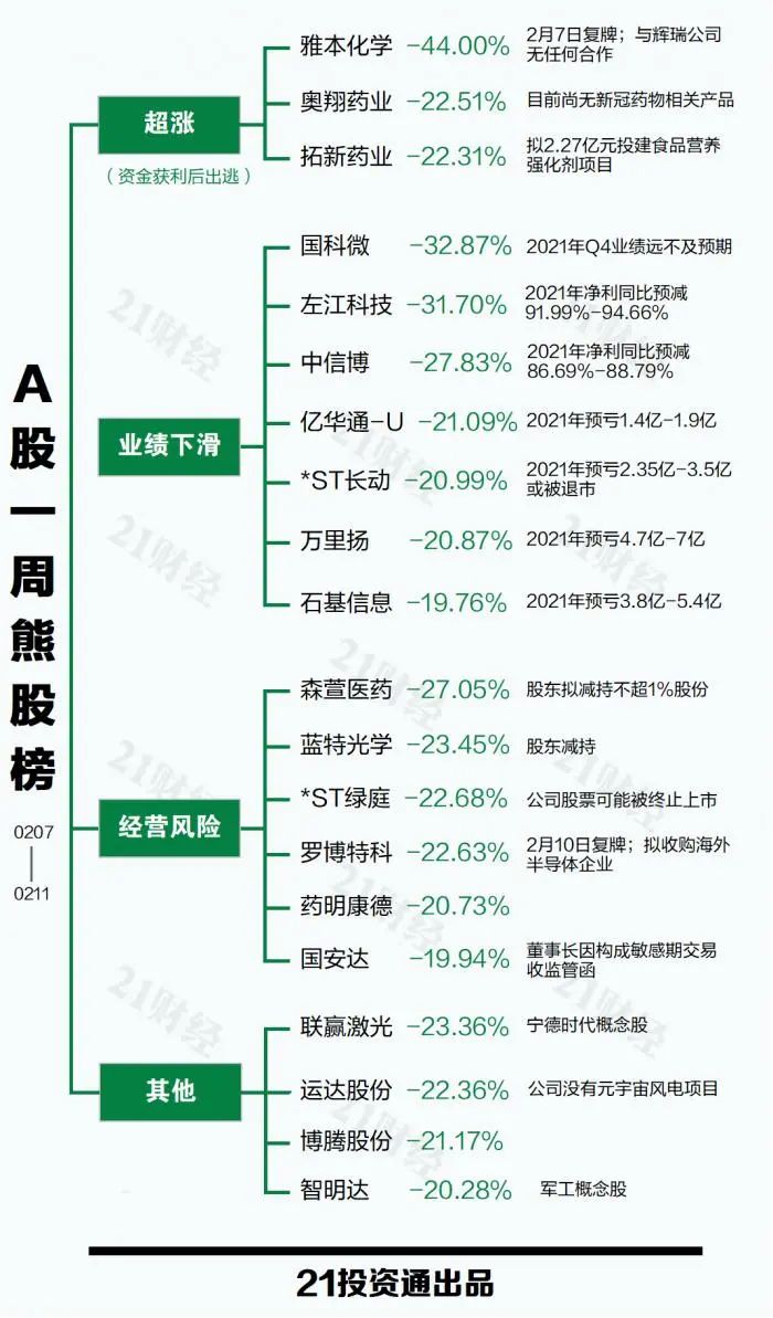 进入业绩预告披露期,当周7家公司因业绩预减致股价下挫而落入熊股榜,跌幅均在20%以上,其中*ST长动(000835.SZ)累计跌20.99%。*ST长动业绩预告显示,预计2021年净利润亏损2.35亿元至3.5亿元,全年营业收入预计为180万元至230万元,2021年末净资产为-7.5亿元至-11亿元,上述三项指标均触碰了退市红线,或在年报正式披露后终止上市。截至2月11日收盘,*ST长动总市值跌剩4.67亿元,为A股市场倒数第二名。