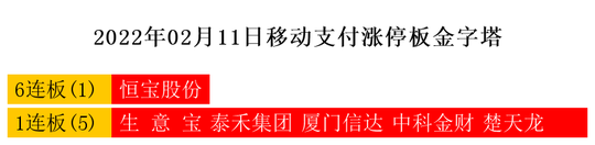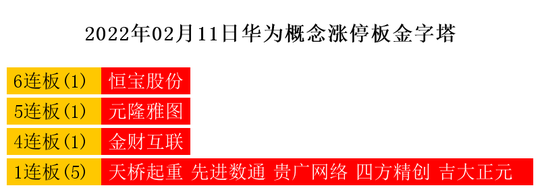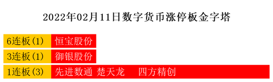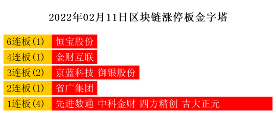 摘要: 今天是2022年02月11日,我们来复盘和梳理今日的热点题材概念主线。今日的热点题材概念有:区块链、华为概念、一带一路、电子商务、文化传媒、移动支付、数字货币。1、区块链概念一共有9支个股涨停。其中,恒宝股份6连板;金财互联4连板;京蓝科技、御银股份3连板;省广集团2连板;先进数通、中科金财、四方精创、吉大正元1连板。2、华为概念一共有