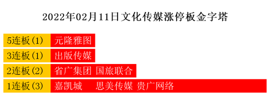 一共有7支个股涨停。其中,元隆雅图5连板;出版传媒3连板;省广集团、国旅联合2连板;嘉凯城、思美传媒、贵广网络1连板。