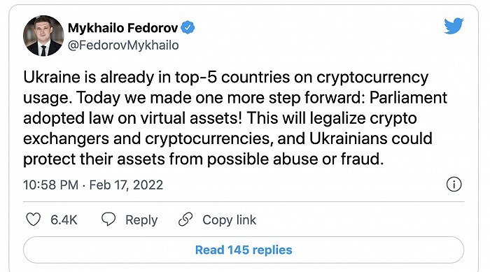 副总理Mykhailo Fedorov在推特上证实了这一消息。他表示,乌克兰已是加密货币使用排名前5的国家,现在又向前迈进了一步,加密交易所和加密货币合法化,意味着乌克兰人可以保护他们的资产免受滥用或欺诈。