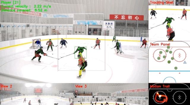 例如这是在冰球训练时,利用AI来跟踪姿态、实时检测队员的站位和追踪球的轨迹: