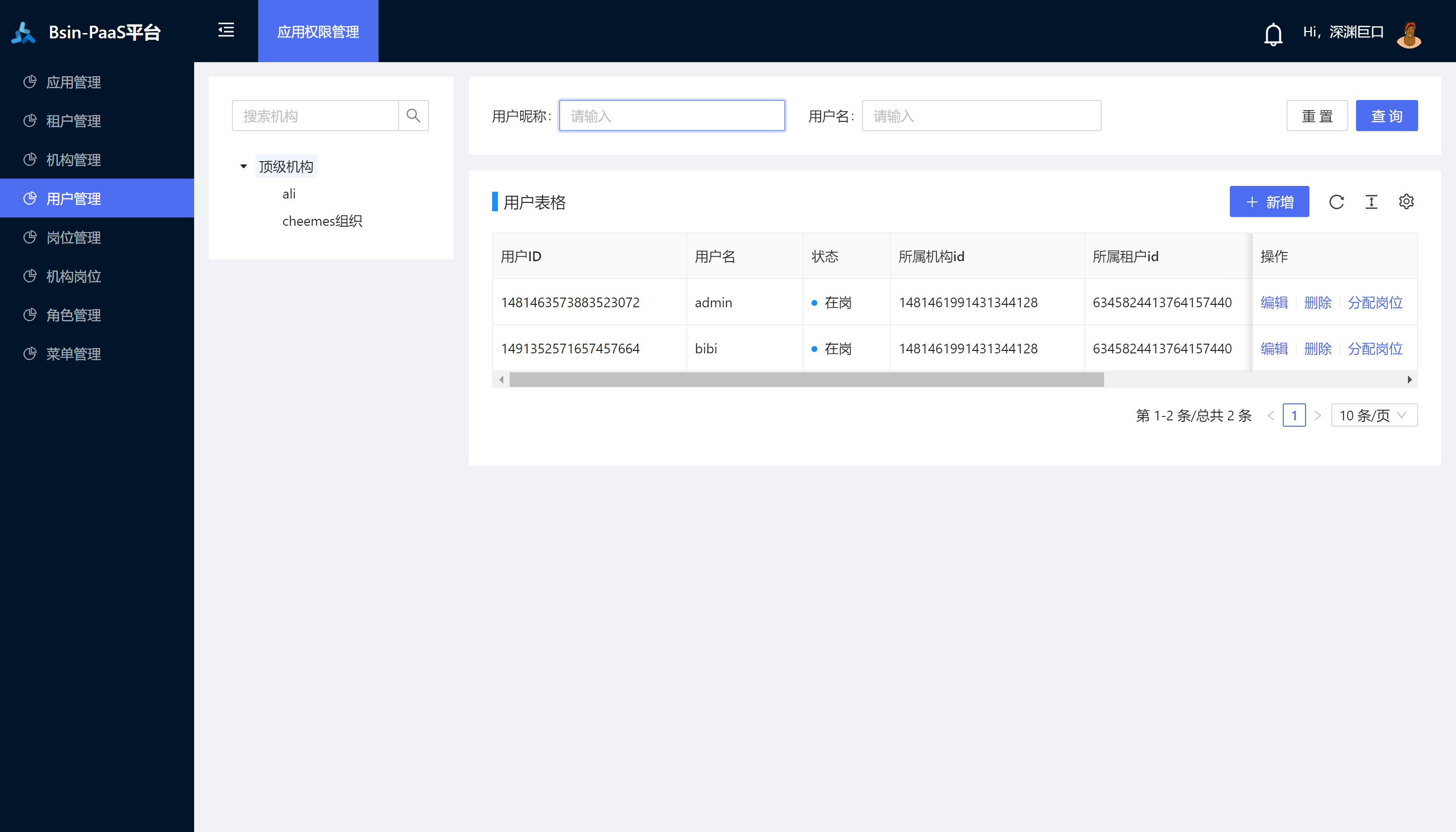 项目演示运营平台 租户:bsin-paas 账户:admin 123456